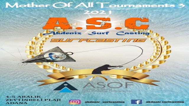 ASOF Amatör Sportif Olta Balıkçılığı Federasyonu Adana üyesi A.S.C - Akdeniz Surf Casting Amatör ve Sportif Olta Balıkçıları Derneği tarafından bu sene 3.sü organize edilecek olan Surf Casting yarışması (Mother Of All Tournaments 3) 4 - 5 Aralık 2021 tarihlerinde Adana, Yumurtalık/Zeytinbeli Plajı’nda gerçekleştirilecek.