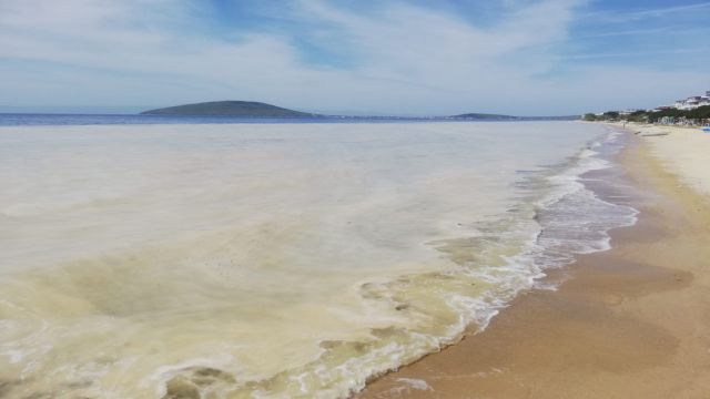 Balıkesir'deki Avşa Adası'nın kıyıları, son zamanlarda sıkça görülen deniz salyası ile kaplandı.