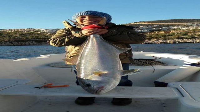 Antalya'nın Kaş ilçesinde 14 yaşındaki Levent Can Pulat, balıkçı olan babası ile çıktığı avda oltayla 110 santim uzunluğunda 12 kilo ağırlığında 'Akya' balığı yakaladı.