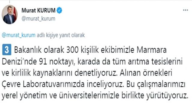 Bakan Kurum Twitter hesabından Marmara Denizi'nde görülen deniz salyalarıyla ilgili yazılı açıklama yaptı. Kurum, sorunun ortak akılla çözülebileceğini ifade ederek, "3 tarafı denizlerle çevrili ülkemizin mavi vatanlarını tehdit eden önemli sorunlardan birisi de Deniz Salyası (Müsilaj). Marmara Denizi'nde görülen ve hepimizi derinden etkileyen çevresel soruna da yine hep birlikte-ortak akılla-çözüm üreteceğiz. Temelde Müsilaja yol açan 3 neden öne çıkıyor; Küresel ısınmanın yol açtığı deniz suyu sıcaklığındaki yükselme, denizdeki durağanlık ve kirlilik. Bakanlık olarak 300 kişilik ekibimizle Marmara Denizi'nde 91 noktayı, karada da tüm arıtma tesislerini ve kirlilik kaynaklarını denetliyoruz. Alınan örnekleri Çevre Laboratuvarımızda inceliyoruz. Bu çalışmalarımızı yerel yönetim ve üniversitelerimizle birlikte yürütüyoruz. Bu konuda belediyelerimize büyük işler düşüyor. Çözüme herkesi dâhil ederek tüm tarafların katılımıyla 4 Haziran'da 'Marmara Denizinde Müsilaj Sorunu ve Çözüm Önerileri' çalıştayımızı yapacağız. 6 Haziran'da da 'Marmara Denizini Koruma Eylem Planı'nı kamuoyuyla paylaşacağız" ifadelerini kullandı.