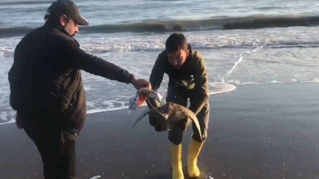 Kıyıya vuran 'mandabaş vatozu' denize bırakıp yaşamasını sağladı