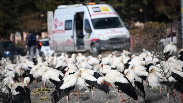 Konya'da göç sırasında olumsuz hava şartlarından etkilenerek şehir merkezine inen leyleklere belediye ekiplerince balık veriliyor.
