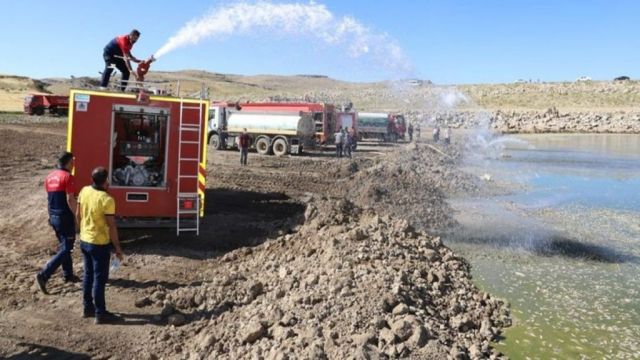 Göletin kurumaya yüz tutmasından kaynaklı olduğu tespit edilen balık ölümlerinin önüne geçmek için Büyükşehir Belediyesine bağlı itfaiye araçlarıyla buraya su takviyesi yapıldı.