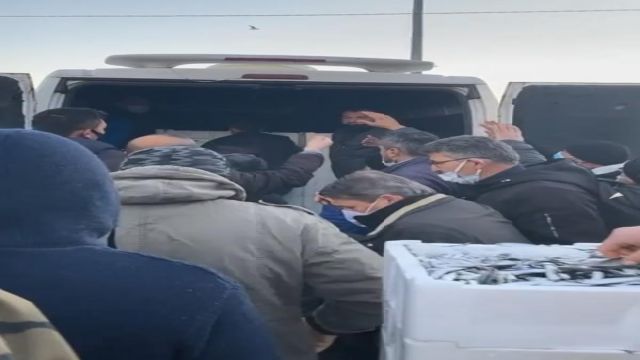 Karadeniz'de hamsi avı yasağının ilk haftasında Ordu'nun Altınordu ilçesindeki Kumbaşı Balıkçı Hali’nde buzhane hamsisine talep yoğunluğu yaşandı. Günün erken saatlerinde balık haline gelen balıkçı esnafı, TIR ve kamyonlarla balık haline getirilen hamsileri alabilmek için birbiriyle yarıştı. Balıkçı esnafı, kasalar dolusu hamsiyi araçlarına yükledi. Balık halinde hamsi alabilmek için birbiriyle yarışan balıkçıların o anları cep telefonu kamerasına yansıdı.