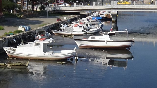 Kent merkezinden geçen Sarıçay'da, deniz suyunun çekilmesi nedeniyle su seviyesi düştü. Sarıçay’da bağlı bulunan balıkçı tekneleri de karaya oturdu. Balıkçılar teknelerinin balçık içinde kalmasını önlemeye çalıştı.