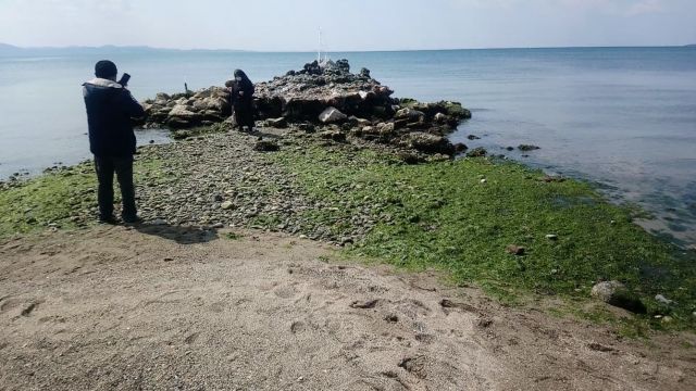 Yüzerek gidilen kayalıklara, sular çekilince yürüyerek çıktılar