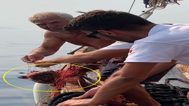 Muğla’nın Bodrum ilçesinde 'Aksona Mehmet' olarak tanınan son süngerci Mehmet Baş (72), hayalet ağa takılan orfozu kurtardığı anları, sosyal medya hesabından paylaştı.