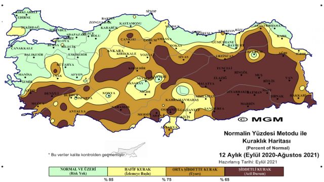 Meteoroloji Genel Müdürlüğü'nün Ağustos Ayı Kuraklık Analiz raporları yayımlandı. Meteorolojik kuraklık durumunu gösteren haritalarda, Ege Bölgesi'nin tamamı, Marmara'nın İstanbul dahil büyük kısmı, İç Anadolu, Akdeniz ve Doğu Anadolu'da da bazı bölgeler için 'acil durum' uyarısının da bulunduğu, 'şiddetli kurak' ağustos ayı yaşandı.