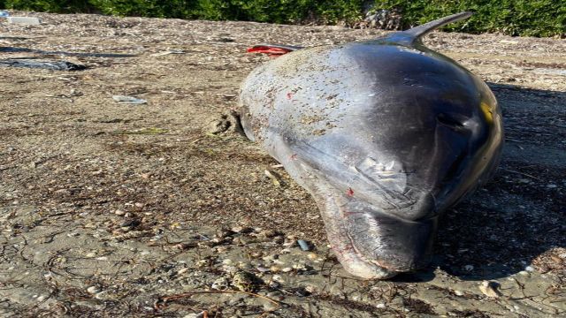 Balıkesir’in Ayvalık ilçesinde ölü bir yunus, karaya vurdu.