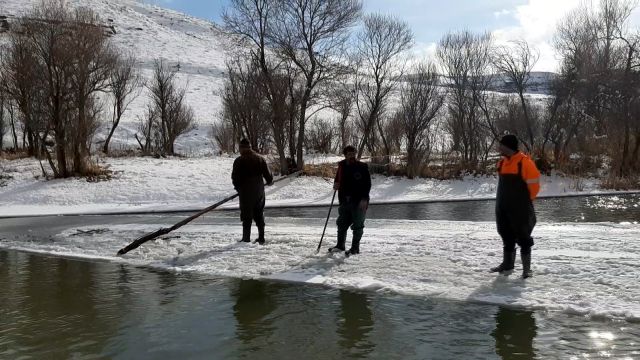 Yaklaşık 20 santimetre kalınlığındaki buz kütlesini kazmalarla kırarak üzerine çıkan 3 kişi nehrin karşı tarafına geçmeye çalıştı.