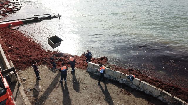 Kadıköy, Caddebostan Sahili'ne lodos nedeniyle kırımızı yosun doldu. Sahil şeridini kaplayan kırmızı yosunları, temizlemek çalışma başlatıldı. İBB Deniz Hizmetleri Müdürlüğü kıyı temizleme ekipleri, yosunları temizlemek için çalışma başlattı Toplanan yosunlar, kamyonlara doldurularak götürüldü.