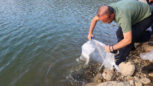 Konuşmaların ardından Tuna ile Vali İlhami Aktaş ve beraberindekiler, pullu sazan balığı yavrularını gölete saldı.