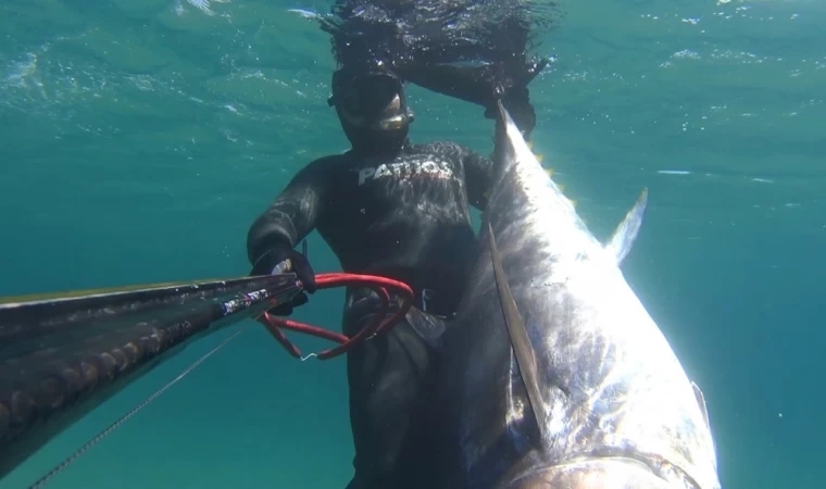 Tüpsüz dalışında, 110 kilogram ağırlık ve yaklaşık 1,8 metre uzunluğa sahip orkinos avlayarak kıyıya çıkan Önen, bu anları su altı kamerasıyla kaydetti.