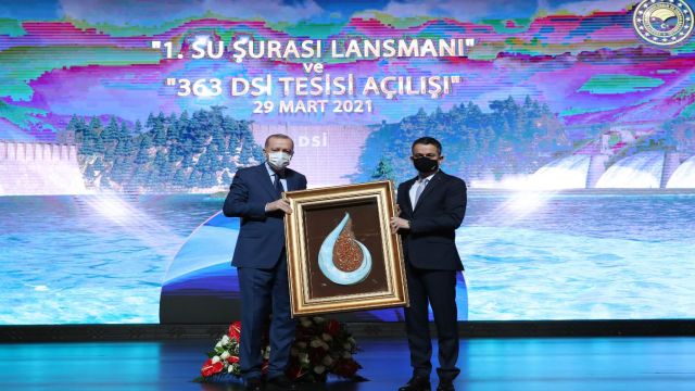 Cumhurbaşkanı Erdoğan, Cumhurbaşkanlığı Külliyesi'nde düzenlenen, 1'nci Su Şurası Lansmanı ve Devlet Su İşleri Genel Müdürlüğü tarafından yapımı tamamlanan 363 tesisin toplu açılış törenine katıldı. Erdoğan, yapılan tesisler sayesinde 146,5 milyon metreküp su depolandığını, yıllık 12.3 milyon metreküp içme suyu elde edildiğini, günlük 299 bin metreküp suyun arıtıldığını, 418 bin 500 dekar arazinin sulu tarıma açıldığını belirtti. Erdoğan, "Böylece Türk ekonomisine yıllık 427 milyona yakın katkı sağlanmıştır. Aralarında baraj, içme suyu sulama toplulaştırma, atık su ve taşkın koruma tesislerinin yer aldığı toplam yatırım tutarı 5 milyar 200 milyona varan bu eserlerin ülkemize hayırlı olmasını diliyorum" dedi.