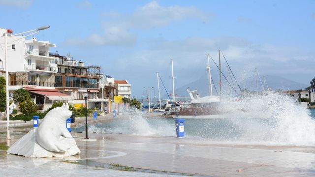 Datça ilçe merkezindeki, güney yönüne bakan mavi bayraklı Kumluk Plajı ise fırtınadan en çok etkilenen bölge oldu. Datça'nın 50-60 santimetrelik derinliği ile en sığ plajlarından biri olan Kumluk Plajı, oluşan dalgalarla açık denizleri aratmadı.