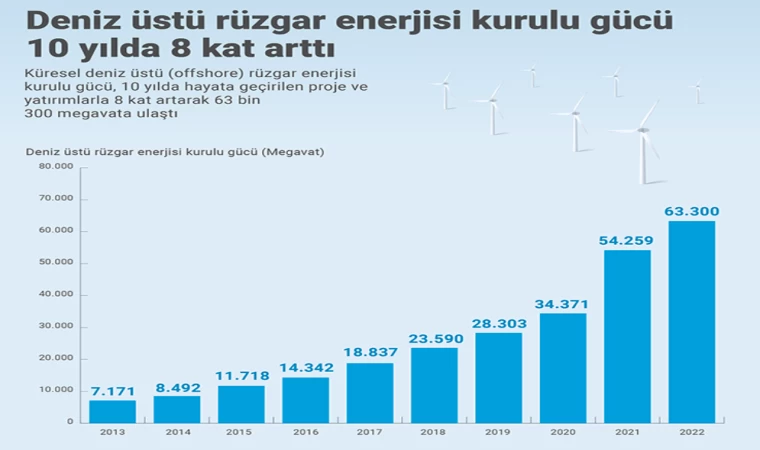 Deniz üstü rüzgar enerjisi kurulu gücü, 2022 sonu itibarıyla 2013'teki 7 bin 171 megavat seviyesine göre 8 kat artarak 63 bin 300 megavata ulaştı.