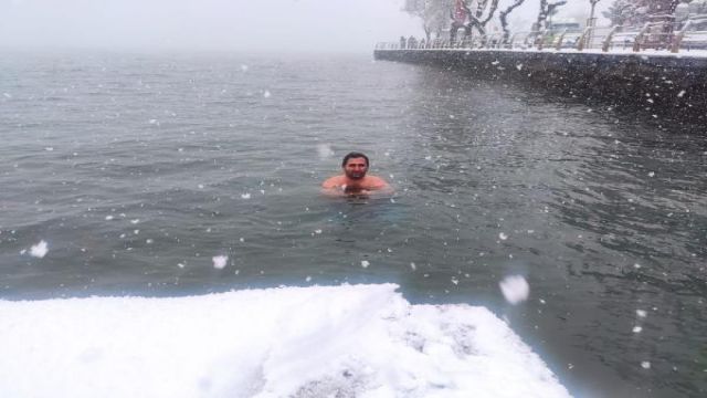 Sarıyer'de dün sabah saatlerinde ilkokul öğretmeni Murat Tosun, Taş İskele'de kar yağışına aldırış etmeden denize girdi. Tosun, önce karların içine uzandı, sonrasında denize girdi ve bir süre yüzdü. Sarıyer'de doğup büyüyen Tosun, "Çocukluğumuzda yaz kış demeden denize giren Nubar Terziyan'a çok özenirdik. Acaba biz de bir gün yapabilir miyiz diye. Son birkaç yıldır da alışkanlık haline geldi. Zaten Sarıyer'in yazını da kışını da çok seviyorum. Her mevsimde denize giriyorum. Çok keyifli. Kar varken denize girmeden önce kendimi karla soğutuyorum, sonrasında zaten deniz dışarıya göre daha sıcak geliyor." dedi.