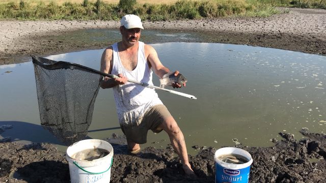 Köylüler, kuruyan göletteki su birikintilerinde oksijensiz kalan balıklar için zamanla yarıştı
