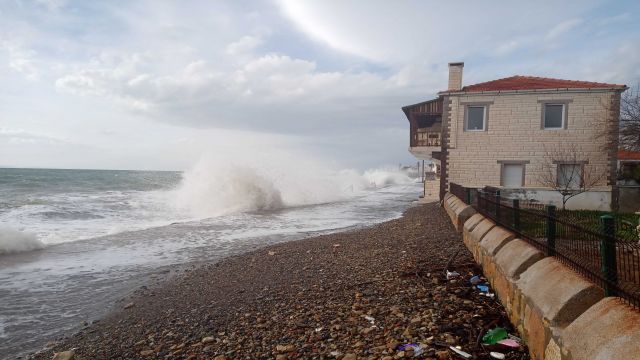 Küçükkuyu'da dev dalgalar sahili aşıp, evlere ulaştı