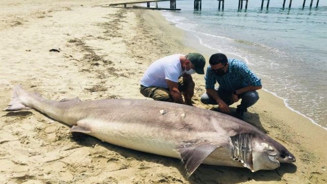 Aydın’ın Kuşadası ilçesinde 3.7 metre uzunluğunda 'boz camgöz' cinsi bir köpek balığı sahilde ölü olarak bulundu. Ekosistemi Koruma ve Doğa Sevenler Derneği (EKODOSD) yetkilileri köpek balığının kesin ölüm nedenini belirlemek için çalışma başlattı.