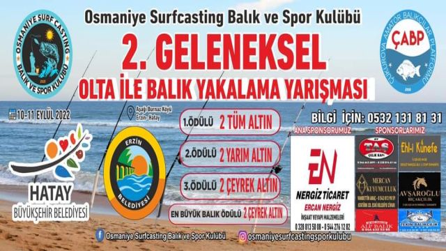 Osmaniye Surfcasting Balık ve Spor Kulübü tarafından Hatay Erzin burnaz Plajında düzenlenecek Olta İle Kıyıdan Balık Yakalama Turnuvası’nın amacı Amatör ve Sportif Olta Balıkçılığını tanıtarak, sevdirmek, gelişmesine katkı sağlamak, olta ile balık avına özendirmek ve sürdürülebilir sucul hayatın devamlılığını sağlamak için kişileri bilgilendirmektir.