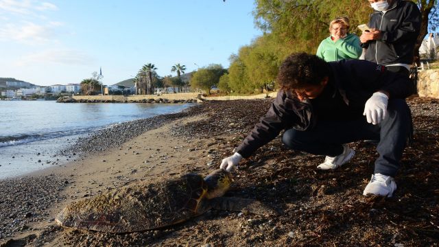 Muğla'nın Datça ilçesinde ‘caretta caretta’ cinsi deniz kaplumbağasının sahilde hareketsiz yattığını gören vatandaşlar Tarım ve Orman İlçe Müdürlüğü’ne ihbarda bulundu.