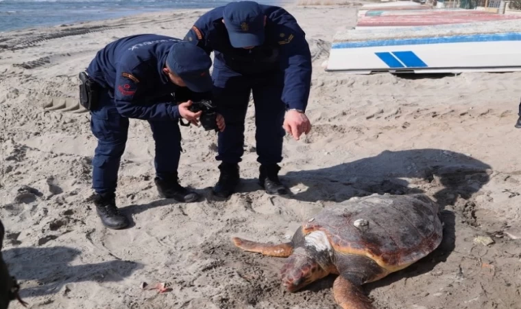 Telef olduğu belirlenen deniz kaplumbağasının incelemenin ardından belediye ekiplerince gömüleceği öğrenildi.