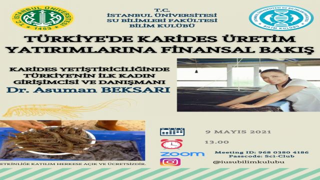 İstanbul Üniversitesi Su Bilimleri Fakültesi Bilim Kulübü tarafından 9 Mayıs Pazar günü saat 13.00'da Karides Yetiştiriciliğinde Türkiye'nin İlk Kadın Girişimcisi ve Danışmanı Dr. Asuman BEKSARI ile "TÜRKİYE'DE KARİDES ÜRETİM YATIRIMLARINA FİNANSAL BAKIŞ" başlıklı etkinlik düzenlenecektir.
