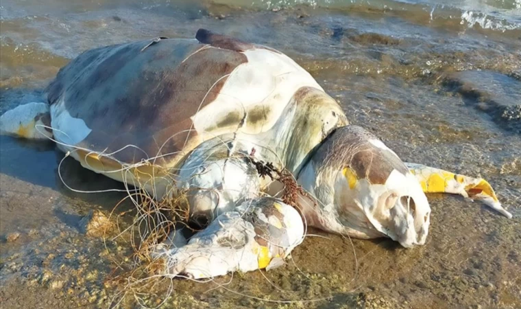 Carettayı sahile getiren Polat, yaptığı incelemede deniz canlısının boynuna ve yüzgeçlerine "hayalet ağ" olarak tabir edilen balık misinası dolanması sonucu öldüğünü belirledi.