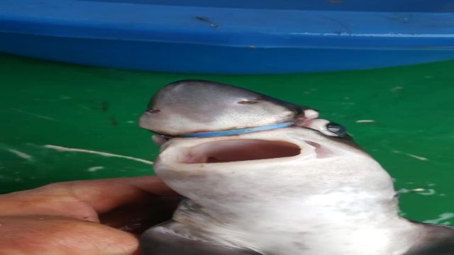 Yavru köpek balığının başına takılan plastik halkayı çıkardı